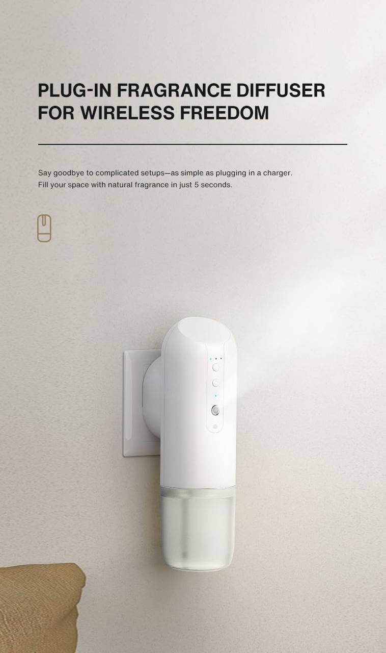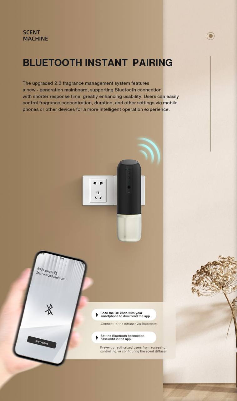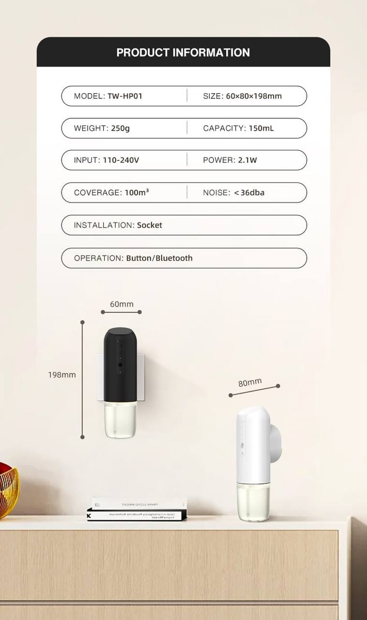 The diffuser utilizes advanced Nano Atomization technology for fast and effective fragrance dispersion with fine particles. With a coverage area of up to 100 cubic meters (100 \text{m}^3), it ensures your living room, bedroom, or office is completely refreshed.