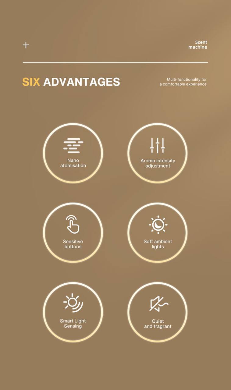 Enjoy the scent without the noise! The device operates at less than 36 decibels (< 36dBA), making it ideal for bedrooms or offices. It also features Soft Ambient Lights that can be controlled to create a warm and relaxing atmosphere.