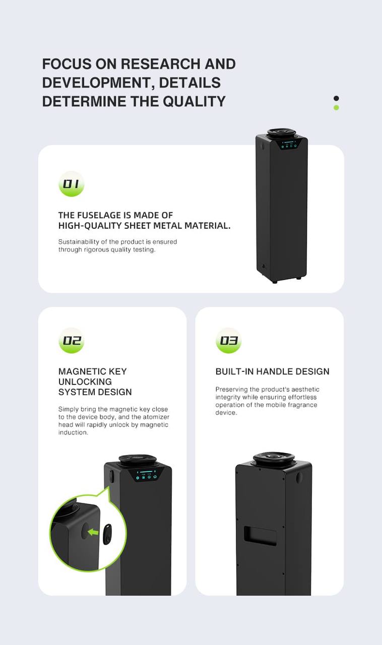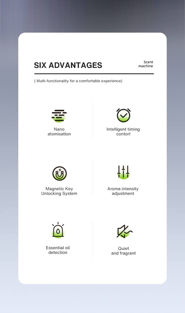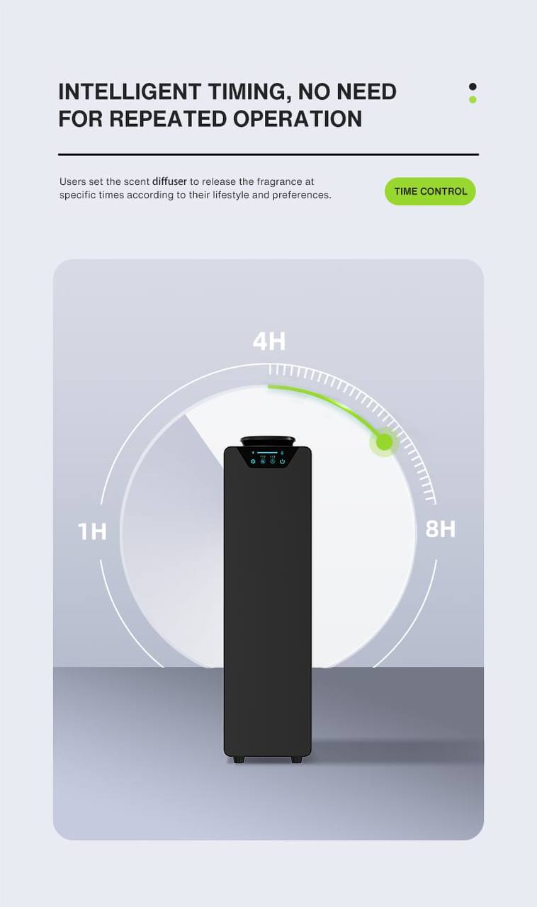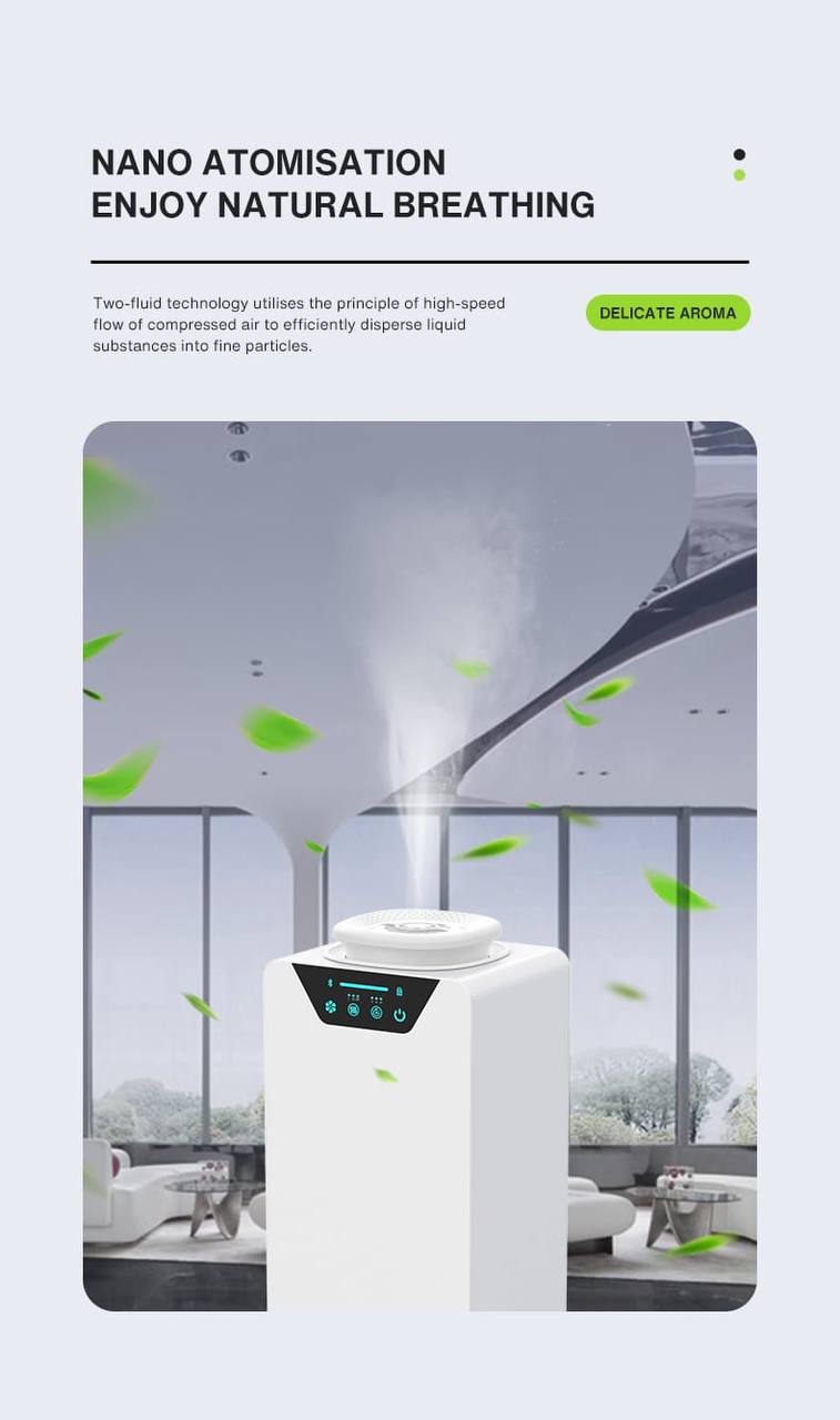 • Nano Atomization Technology: The system guarantees precise and highly efficient diffusion of fragrance particles, delivering a stable, natural scent without disturbance or unwanted humidity.