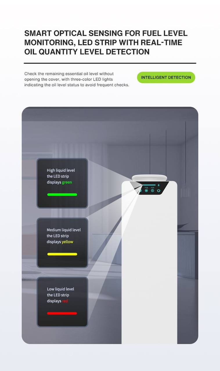 • Adjustable Scent Intensity: Ability to switch between multiple concentration levels to perfectly match the environment size and your personal preference.